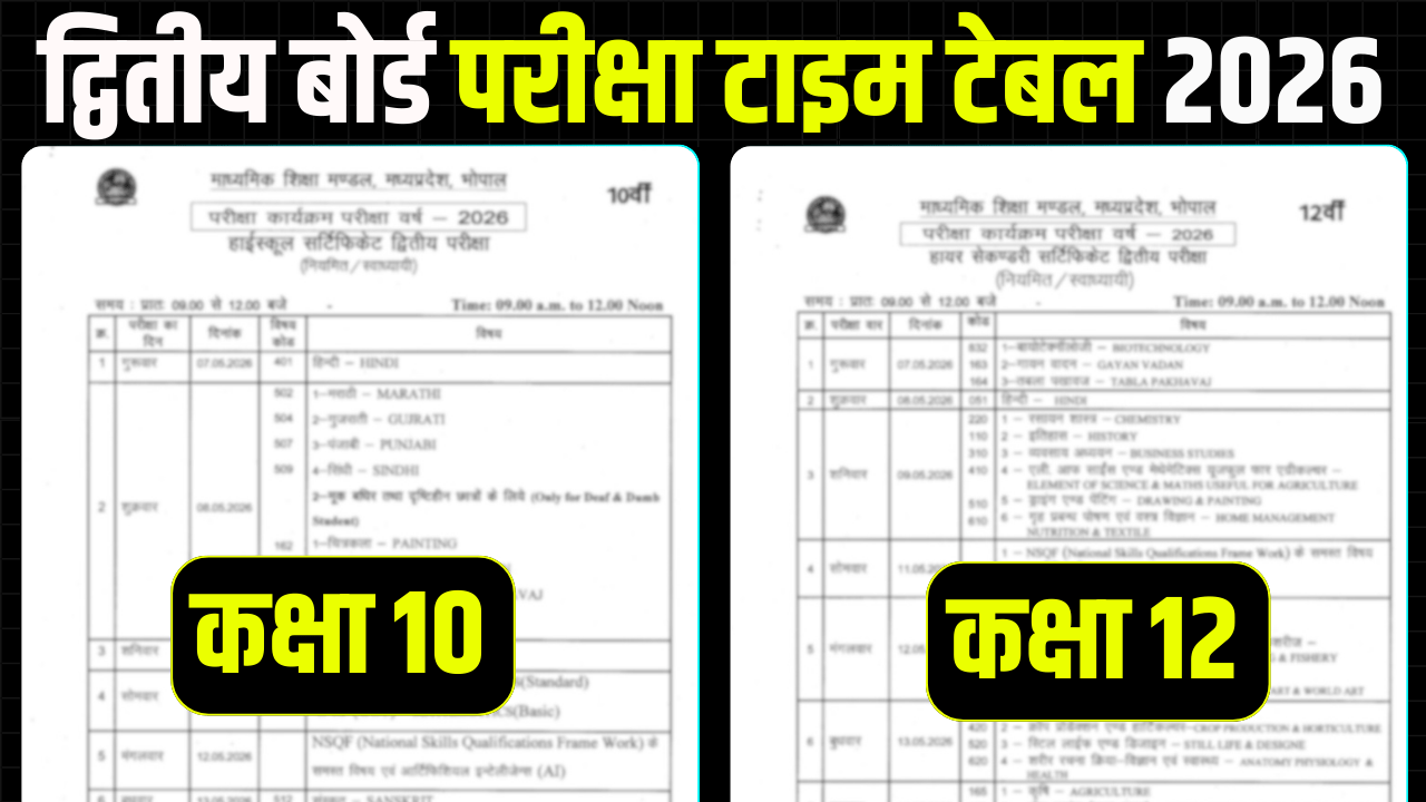एमपी बोर्ड द्वितीय बोर्ड परीक्षा 2026 (Mp Board second Board Exam 2026-27 Time Table in Hindi) : एमपी बोर्ड ने शैक्षणिक सत्र 2026 27 द्वितीय… Read more: 2nd Board Exam 2026 Date Sheet Release | 10वीं 12वीं द्वितीय परीक्षा 2026 टाइम टेबल पीडीएफ - MP Board Result 2026: आ गई बड़ी खबर! इस दिन आ सकता है 10वीं-12वीं का रिजल्ट