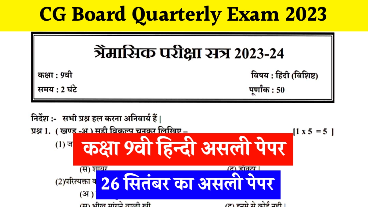 CG Board Class 9 hindi Trimasik Paper 2023 : मध्यप्रदेश द्वारा आयोजित त्रैमासिक परीक्षा का आगमन शुरू हो चुका है, और विद्यार्थी सब्जेक्ट वाइज ओरिजिनल पीडीऍफ़ की तलाश कर रहे है तो जैसा की आप सबको पता होगा 26 सितम्बर से हिंदी का पेपर शुरू हो रहा है और सभी छात्र CG Board Class 9th Hindi Trimasik Paper 2023 की तलाश कर रहे है, तो CG Board Class 9th Hindi Trimasik Paper 2023 की तलाश कर रहे छात्रों के लिए बड़ी अपडेट सामने आ रही है, आज के इस लेख में हम आप सबको CG Board Class 9th Hindi Trimasik Paper 2023 Original pdf प्रोवाइड कराने वाले है ताकि आप सब Class 9 CG Board Hindi Trimasik Paper 2023 के माध्यम से अपनी तैयारी पूरी करके त्रैमासिक परीक्षा उत्तीर्ण कर सके।