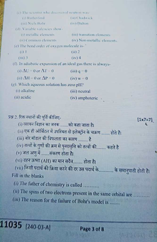 MP Board Varshik Pariksha 11th Chemistry Paper