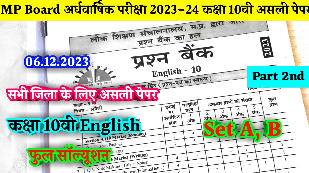 इस पोस्ट में हम MP Board Class 10th angreji Ardhvarshik Pariksha 2023-24 प्रोवाइड कराने वाले है ताकि आप सब MP Board kaksha 10vi angreji Ardhvarshik pariksha 2023 के माध्यम से अपनी तैयारी कर अपने परीक्षा में बहुत अच्छे नंबर ला सकते है। MP Board Class 10 english Paper 2023 दिसम्बर में होने जा रहा है।
