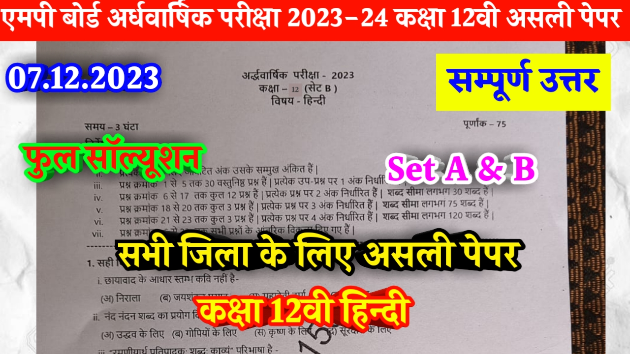 एमपी बोर्ड कक्षा 12 वी हिन्दी अर्द्धवार्षिक परीक्षा 2023-24