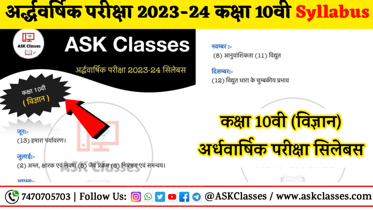 अगर आप एमपी बोर्ड अर्धवार्षिक परीक्षा 2023-24 में अच्छे नंबर लाना चाहते है तो, नीचे दिये गये सिलेबस को बहुत अच्छे से पढ़ कर जाना क्योकि नीचे आपको जो Ardhvarshik pariksha Class 10th Vigyan (Science) syllabus दिखाया गया है। वही पाठ से प्रश्न आपके परीक्षा में देखने को मिलेगा क्यों की यह सिलेबस जारी करने वाला MP board Class 10th Vigyan (Science) Ardhvarshik pariksha है। अर्धवार्षिक परीक्षा में पूरे के पूरे प्रश्न यही से देखने को मिलेगा।