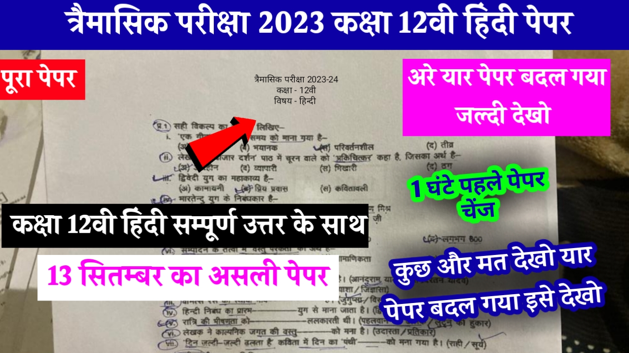 कक्षा 12वी हिन्दी त्रैमासिक परीक्षा 2023-24 असली पेपर