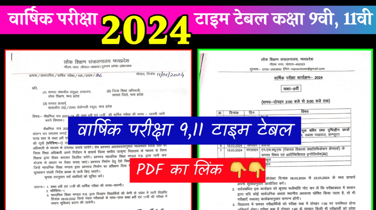 MP Board Class 9th, 11th Annual Exam 2024 Time table | एमपी बोर्ड कक्षा 9वी, 11वी वार्षिक परीक्षा 2024 टाइम टेबल