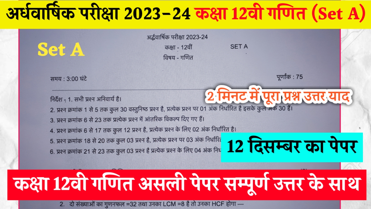कक्षा 12वी गणित अर्द्धवार्षिक परीक्षा 2023-24 असली पेपर