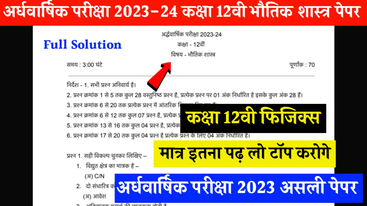 कक्षा 12वी भौतिक शास्त्र अर्द्धवार्षिक परीक्षा 2023-24 असली पेपर
