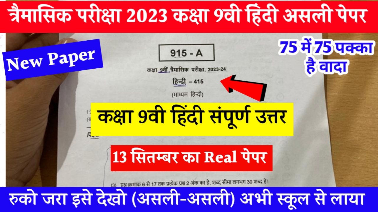 कक्षा 9वी हिन्दी त्रैमासिक परीक्षा 2023-24 असली पेपर
