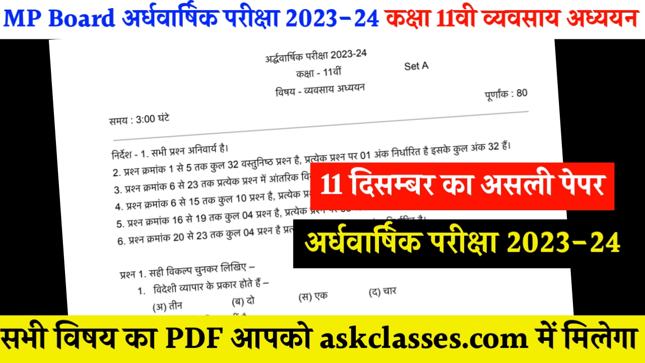 इस पोस्ट में हम MP Board Class 11th Business studies Ardhvarshik Pariksha 2023-24 प्रोवाइड कराने वाले है ताकि आप सब MP Board kaksha 11vi Business studies Ardhvarshik pariksha 2023 के माध्यम से अपनी तैयारी कर अपने परीक्षा में बहुत अच्छे नंबर ला सकते है। MP Board Class 11 Business studies Paper 2023 दिसम्बर में होने जा रहा है।