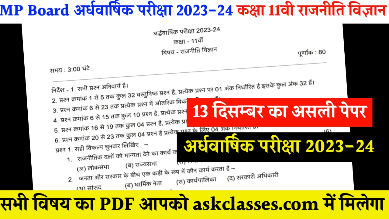 एमपी बोर्ड कक्षा 11 वी राजनीति शास्त्र अर्द्धवार्षिक परीक्षा 2023-24