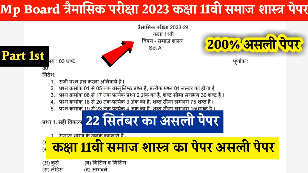 MP Board Class 11th samajshastra Trimasik Paper 2023 : मध्यप्रदेश द्वारा आयोजित त्रैमासिक परीक्षा का आगमन शुरू हो चूका है, और विद्यार्थी सब्जेक्ट वाइज ओरिजिनल पीडीऍफ़ की तलाश कर रहे है तो जैसा की आप सबको पता होगा 12 सितम्बर से हिंदी का पेपर शुरू हो रहा है और सभी छात्र MP Board Class 11th samajshastra Trimasik Paper 2023 की तलाश कर रहे है, तो MP Board Class 11th Samajshastra Trimasik Paper 2023 की तलाश कर रहे छात्रों के लिए बड़ी अपडेट सामने आ रही है, आज के इस लेख में हम आप सबको MP Board Class 11th Samajshastra Trimasik Paper 2023 Original pdf प्रोवाइड करने वाले है ताकि आप सब MP Board Class 11th Samajshastra Trimasik Paper 2023 के माध्यम से अपनी तैयारी पूरी करके त्रैमासिक परीक्षा में उत्तीर्ण कर सके।