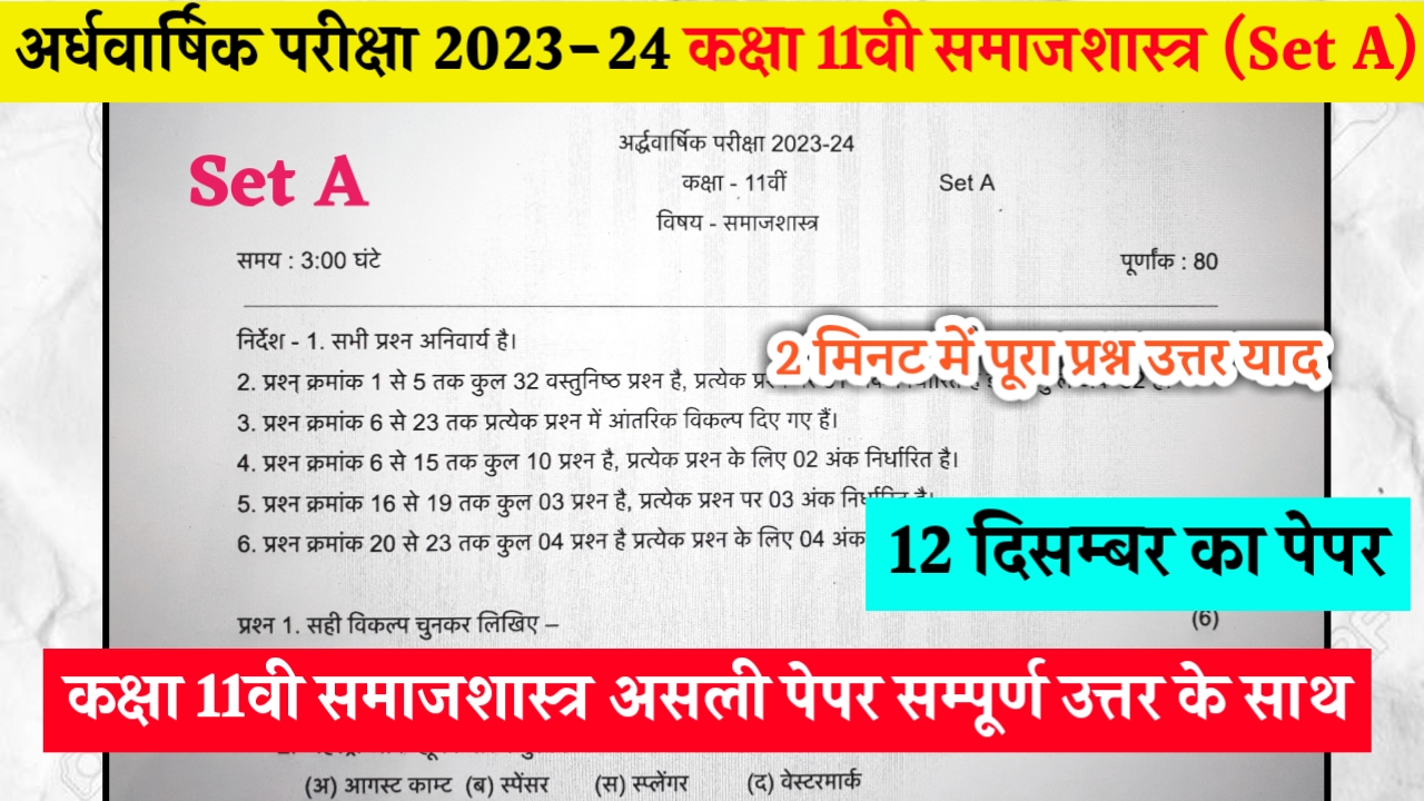 कक्षा 11 वी समाजशास्त्र अर्द्धवार्षिक परीक्षा 2023-24 असली पेपर