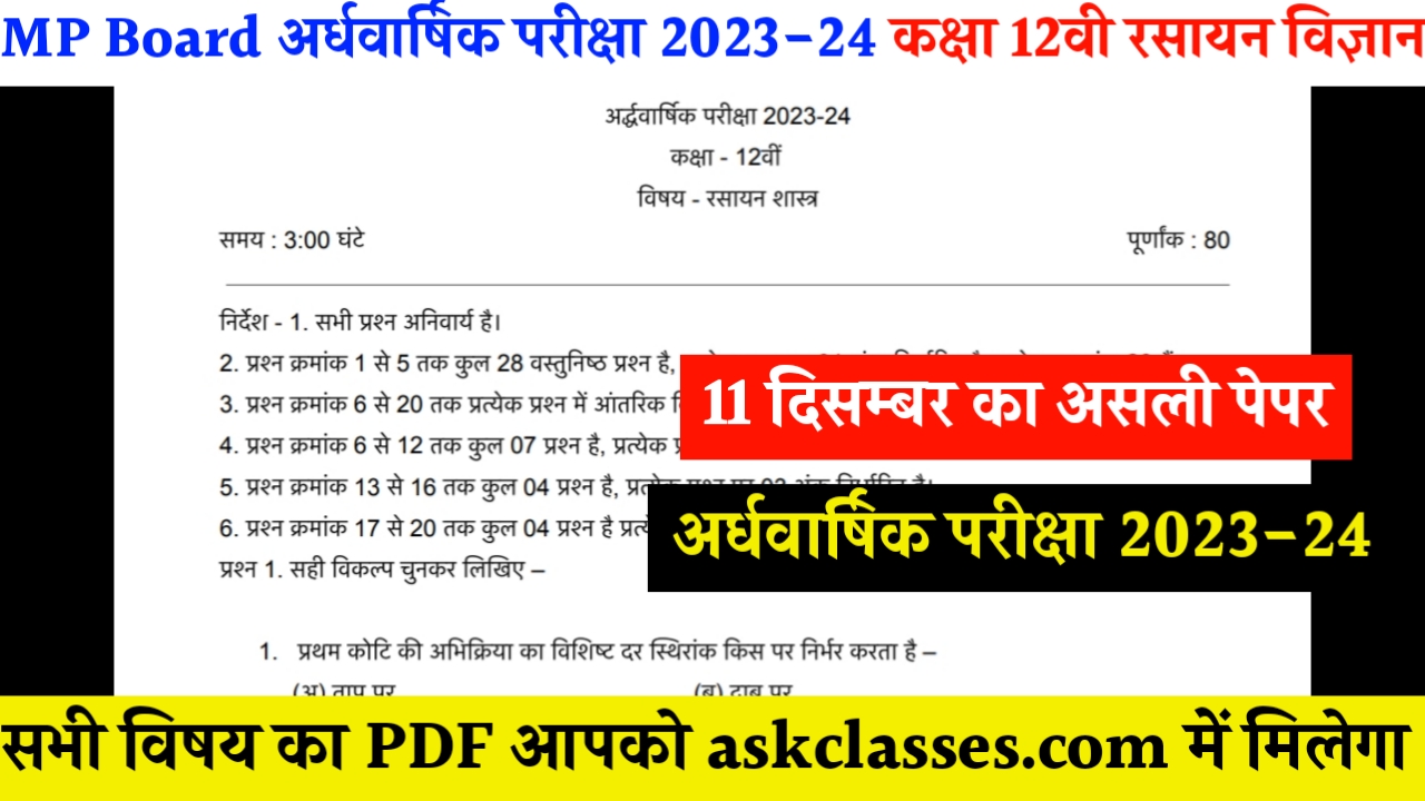इस पोस्ट में हम MP Board Class 12th Chemistry Ardhvarshik Pariksha 2023-24 प्रोवाइड कराने वाले है ताकि आप सब MP Board kaksha 12vi Chemistry Ardhvarshik pariksha 2023 के माध्यम से अपनी तैयारी कर अपने परीक्षा में बहुत अच्छे नंबर ला सकते है। MP Board Class 12 Chemistry Paper 2023 दिसम्बर में होने जा रहा है।