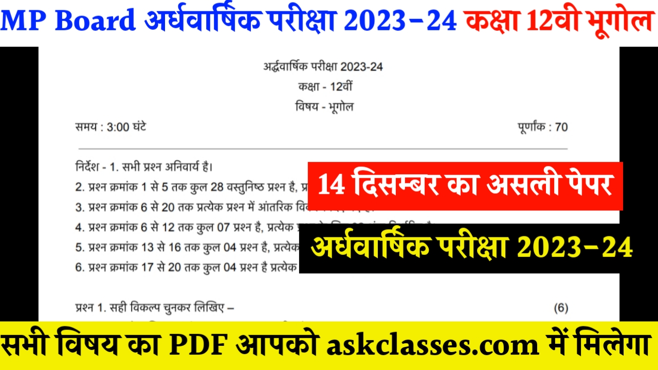 इस पोस्ट में हम MP Board Class 12th Geography Ardhvarshik Pariksha 2023-24 प्रोवाइड कराने वाले है ताकि आप सब MP Board kaksha 12vi Geography Ardhvarshik pariksha 2023 के माध्यम से अपनी तैयारी कर अपने परीक्षा में बहुत अच्छे नंबर ला सकते है। MP Board Class 12 Geography Paper 2023 दिसम्बर में होने जा रहा है।