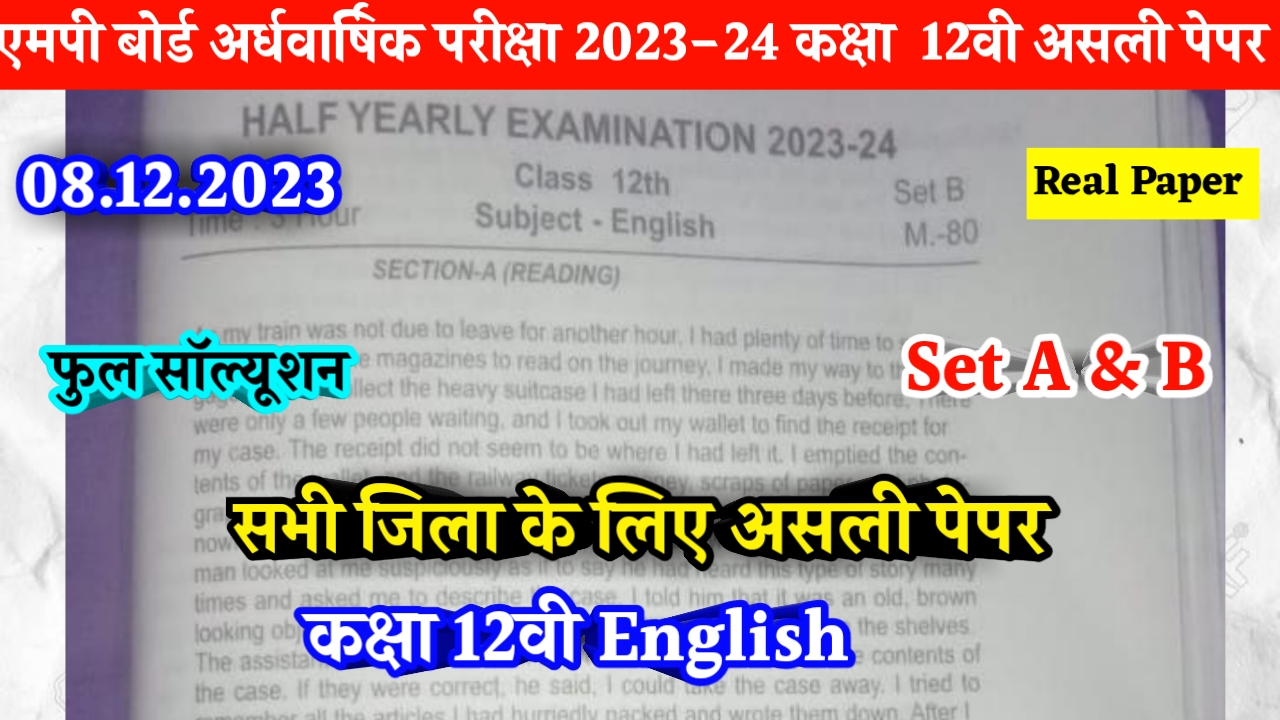 MP Board Class 12th English Ardhvarshik Paper 2023 : मध्यप्रदेश द्वारा आयोजित अर्द्धवार्षिक परीक्षा का आगमन शुरू हो चूका है, और विद्यार्थी सब्जेक्ट वाइज ओरिजिनल पीडीऍफ़ की तलाश कर रहे है। तो जैसा की आप सबको पता होगा 8 दिसम्बर को अंग्रेज़ी का पेपर संपन्न कराया जायेगा और सभी छात्र MP Board Class 12th English Ardhvarshik Paper 2023 की तलाश कर रहे है, तो MP Board Class 12th English Ardhvarshik Paper 2023 की तलाश कर रहे छात्रों के लिए बड़ी अपडेट सामने आ रही है, आज के इस लेख में हम आप सबको MP Board Class 12th English Ardhvarshik Paper 2023 Original pdf प्रोवाइड करने वाले है ताकि आप सब MP Board Class 12th English Ardhvarshik Paper 2023 के माध्यम से अपनी तैयारी पूरी करके अर्द्धवार्षिक परीक्षा में उत्तीर्ण कर सके।